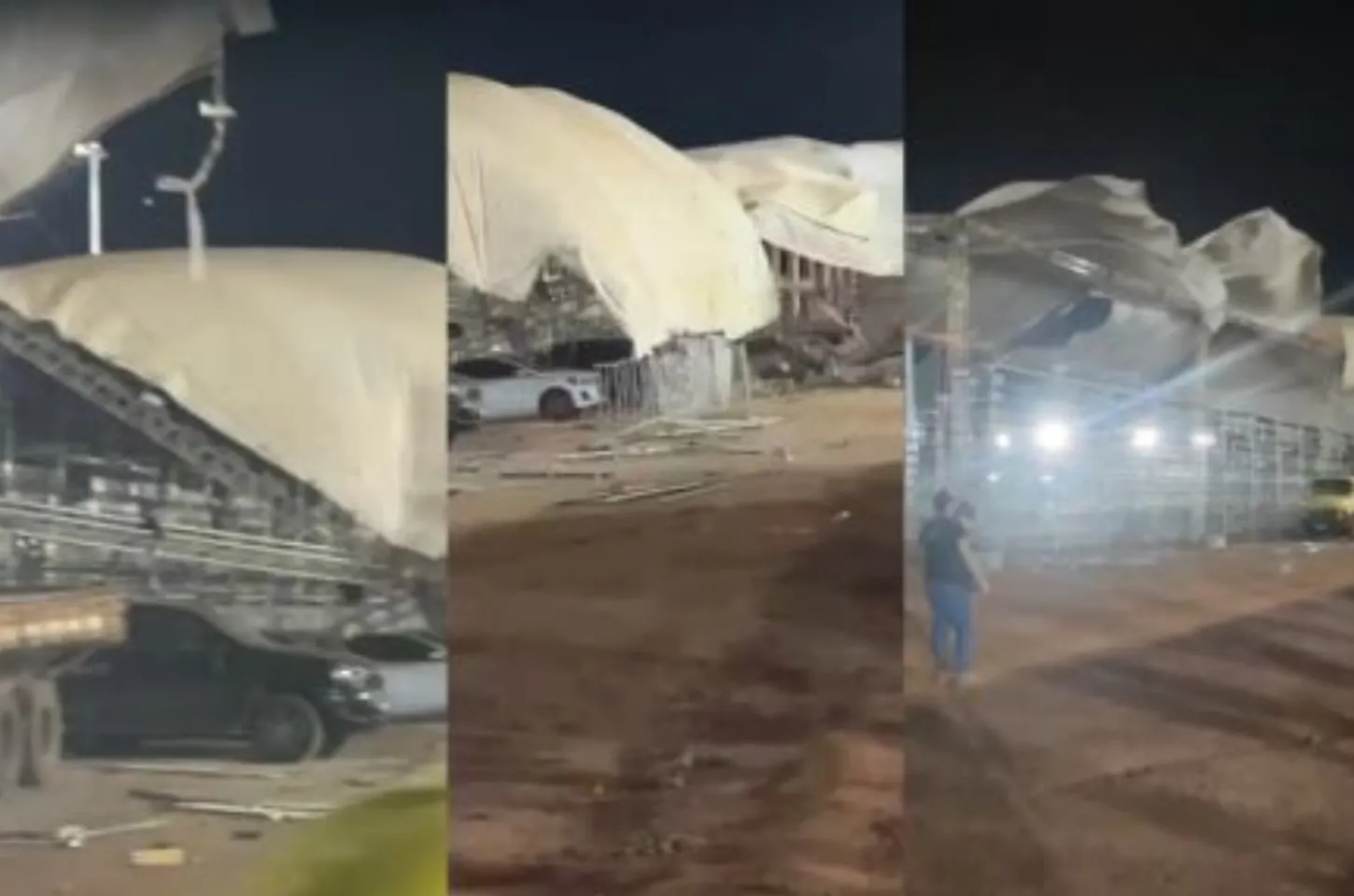Vídeos divulgados nas redes sociais mostram o momento em que a estrutura cede sob a força dos ventos, causando correria e assustando o público, equipes, pilotos e trabalhadores presentes no local.